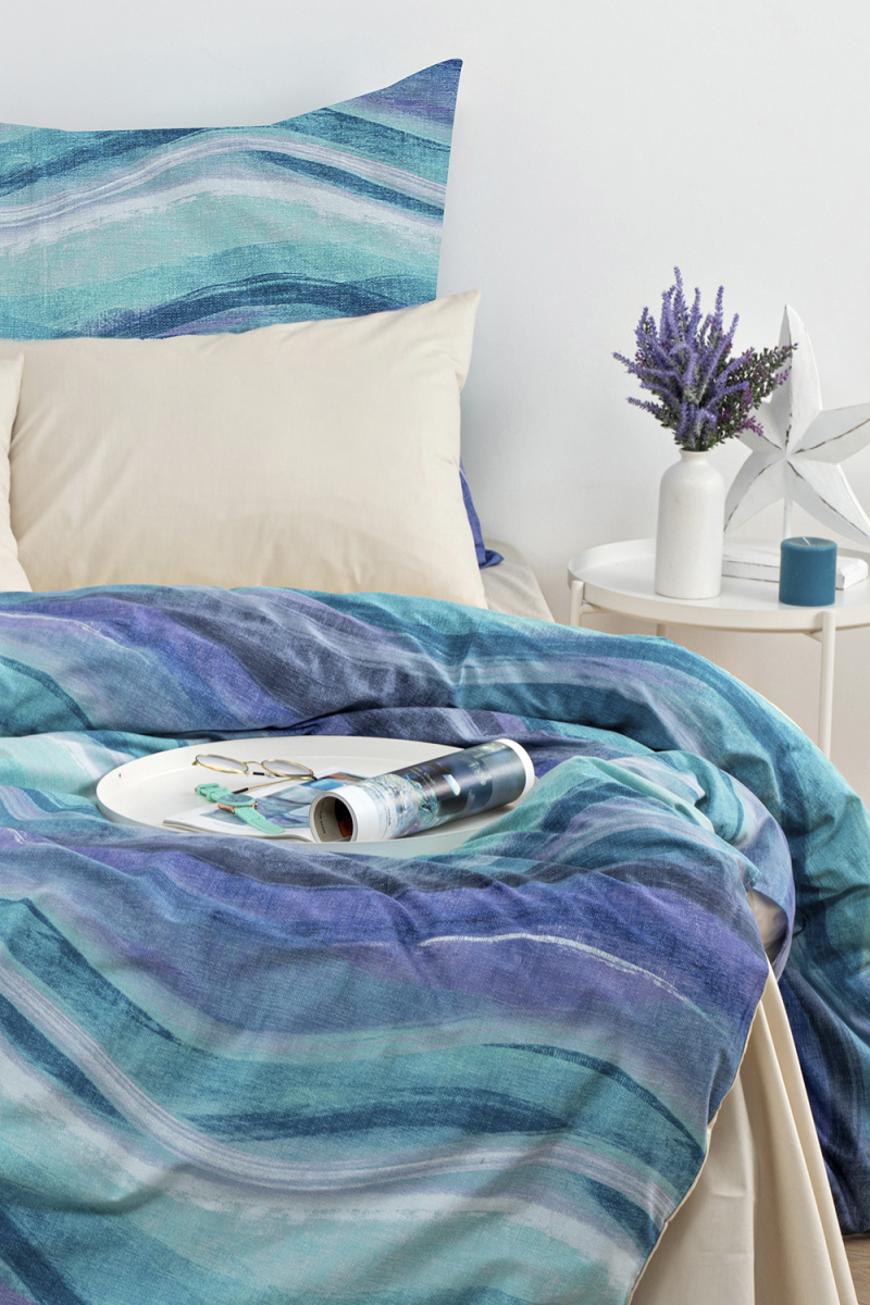 Постельное белье выполнено из сатина высокой плотности (пряжа 40х40) с пигментным окрашиванием. Ткань шелковистая, очень приятная на ощупь. Пододеяльник и наволочки сшиты из основной ткани, простынь и обратная сторона пододеяльника выполнены из ткани-компаньона.