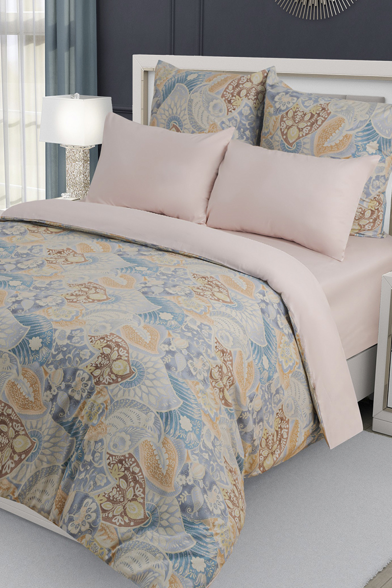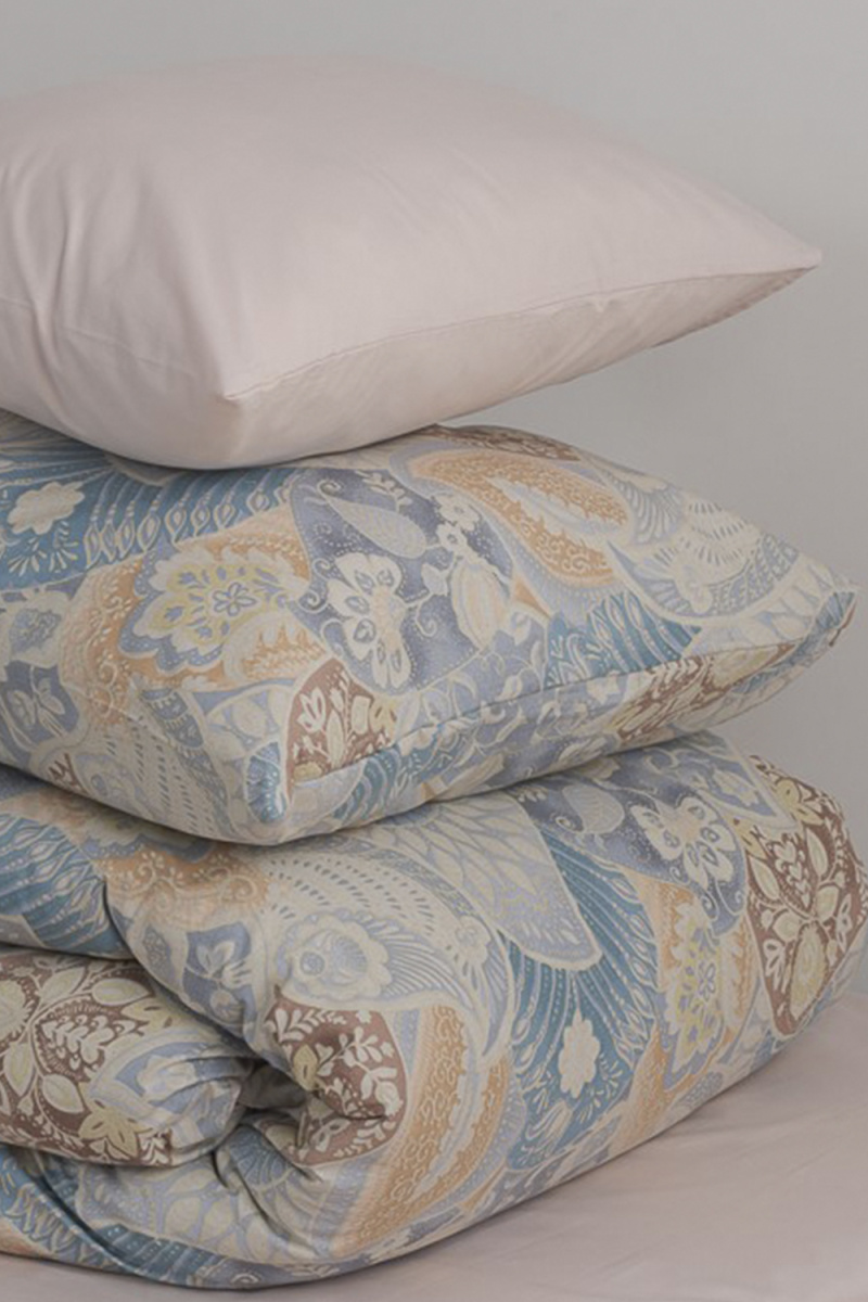 Постельное белье выполнено из сатина высокой плотности (пряжа 40х40) с пигментным окрашиванием. Ткань шелковистая, очень приятная на ощупь. Пододеяльник и наволочки сшиты из основной ткани, простынь и обратная сторона пододеяльника выполнены из ткани-компаньона.