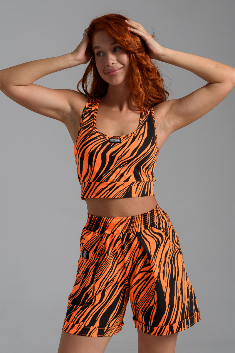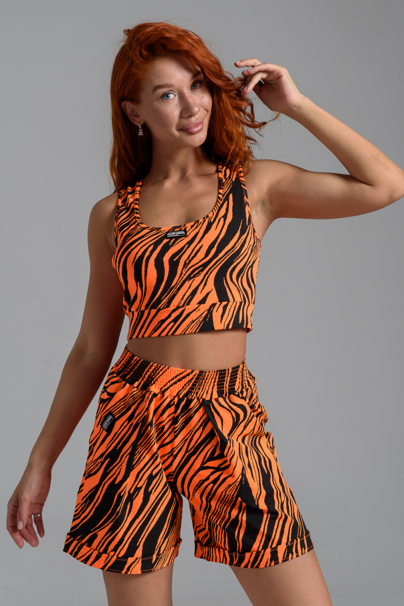 Комплект состоит из топа и шорт. Топ на узких бретелях, с округлой горловиной на полочке и вырезом "борцовка" сзади. Горловина, проймы и вырез на спинке обработаны бейкой из основного полотна. Шорты на поясе, свободные, с боковыми карманами, с декоративными отворотами по низу. В верхней части передних половинок по шву притачивания пояса расположены складки.