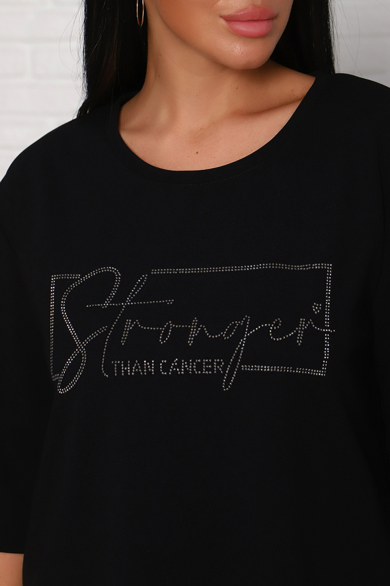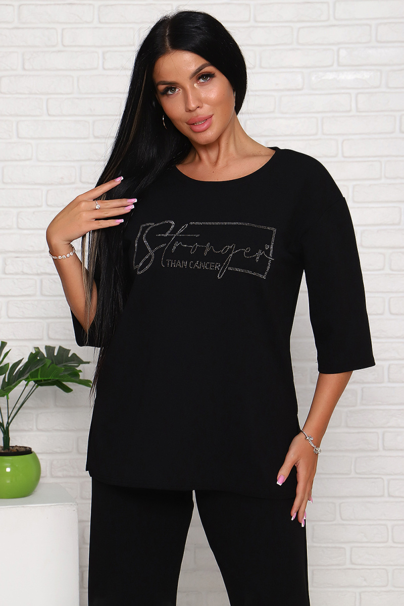 Модель свободного силуэта, на передней части верха стильный принт из страз. Костюм изготовлен из трикотажной комфортной ткани креп, она приятна к телу и на ощупь,не мнётся. Смотрится костюм стильно и современно, подойдёт и для повседневной носки , уместен и для торжества. Длина рукава в замерах указана от начала горловины