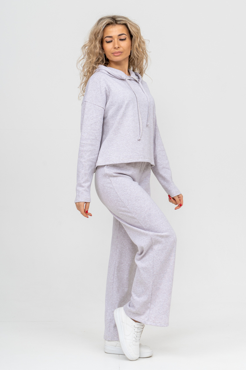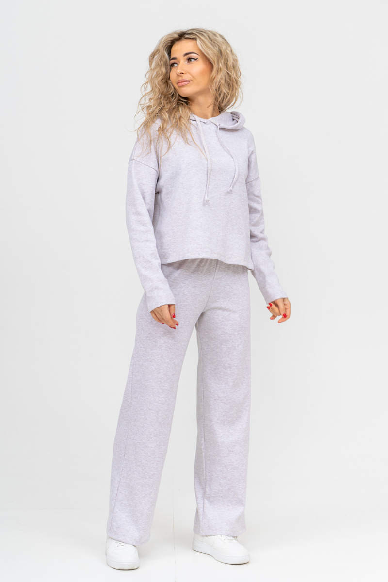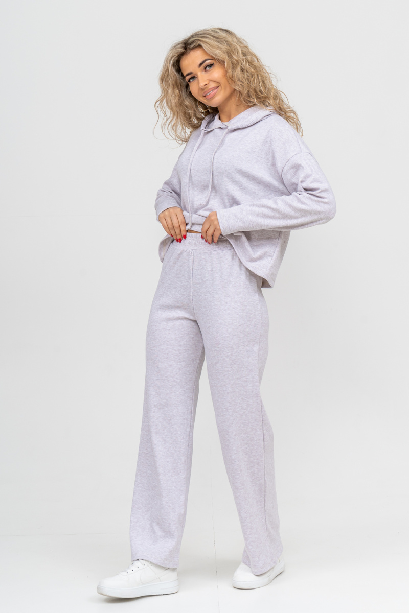 Стильный костюм выполнен из кашкорсе с начёсом. Ткань гладкая с лица и ворсистая с начёсом с изнанки, неприхотлива в уходе и приятная на ощупь. Благодаря особой мягкости, комфортности при носке, дышащей структуре полотна, эта разновидность французского трикотажа широко распространилась по миру. Материал гигроскопичен, поэтому хорошо держит тепло и позволяет телу дышать. Широкие брюки в стиле палаццо - это находка этого сезона. Пояс брюк выполнен на специализированной поясной машине, что делает его максимально качественным. Толстовка свободная, с капюшоном, спущенной линией плеча и слегка удлинённым рукавом. Всё это делает мягкий приятный к телу костюм по настоящему любимым! Костюм можно надевать дома, в качестве повседневной одежды, на работу, в поездку или деловую встречу. Свободный прямой крой свитшота и брюк хорошо скрывает несовершенства, подчеркивает достоинства фигуры и изящный силуэт. Толстовку и брюки можно носить как вместе, так и отдельно. Однотонный дизайн без принта, надписей и дек