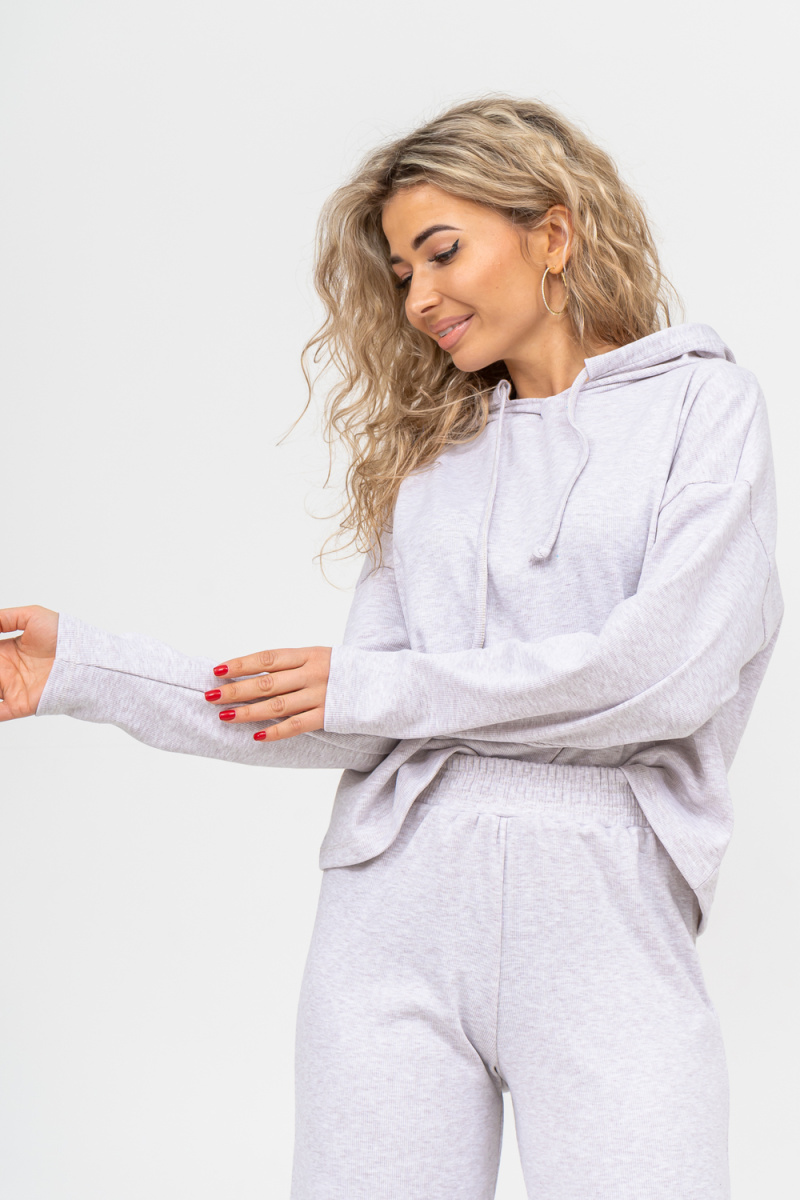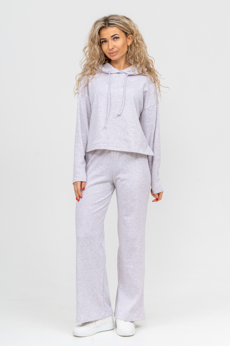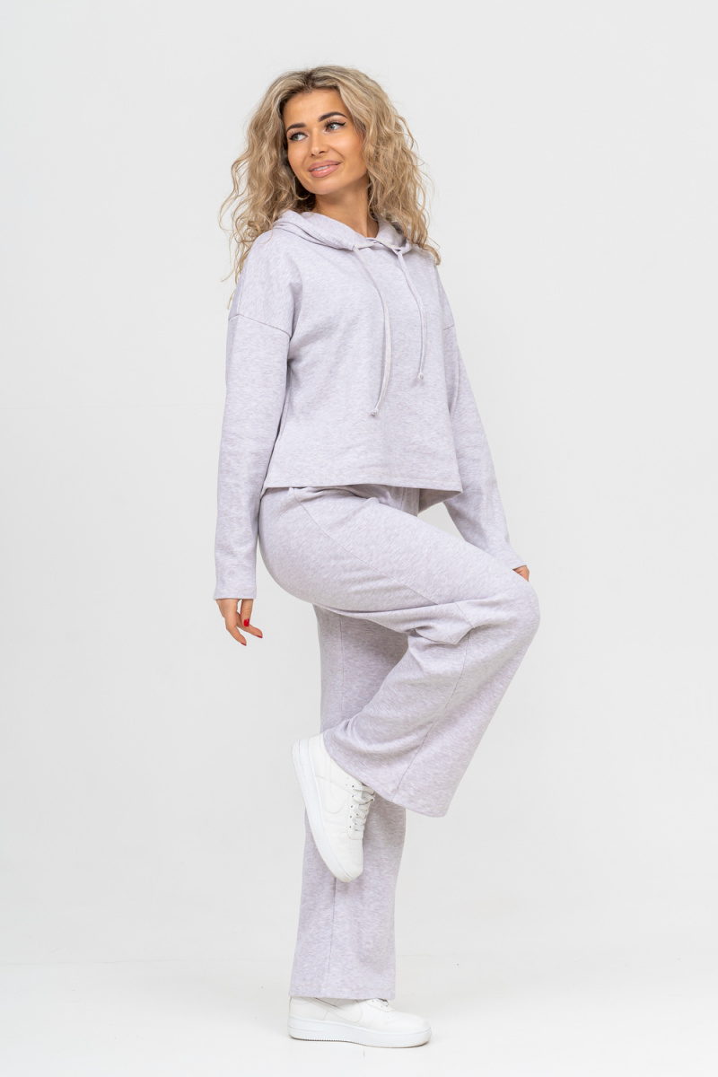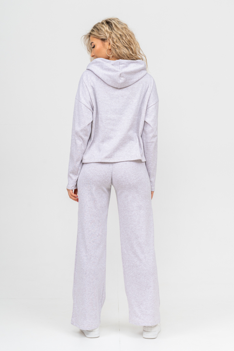 Стильный костюм выполнен из кашкорсе с начёсом. Ткань гладкая с лица и ворсистая с начёсом с изнанки, неприхотлива в уходе и приятная на ощупь. Благодаря особой мягкости, комфортности при носке, дышащей структуре полотна, эта разновидность французского трикотажа широко распространилась по миру. Материал гигроскопичен, поэтому хорошо держит тепло и позволяет телу дышать. Широкие брюки в стиле палаццо - это находка этого сезона. Пояс брюк выполнен на специализированной поясной машине, что делает его максимально качественным. Толстовка свободная, с капюшоном, спущенной линией плеча и слегка удлинённым рукавом. Всё это делает мягкий приятный к телу костюм по настоящему любимым! Костюм можно надевать дома, в качестве повседневной одежды, на работу, в поездку или деловую встречу. Свободный прямой крой свитшота и брюк хорошо скрывает несовершенства, подчеркивает достоинства фигуры и изящный силуэт. Толстовку и брюки можно носить как вместе, так и отдельно. Однотонный дизайн без принта, надписей и дек