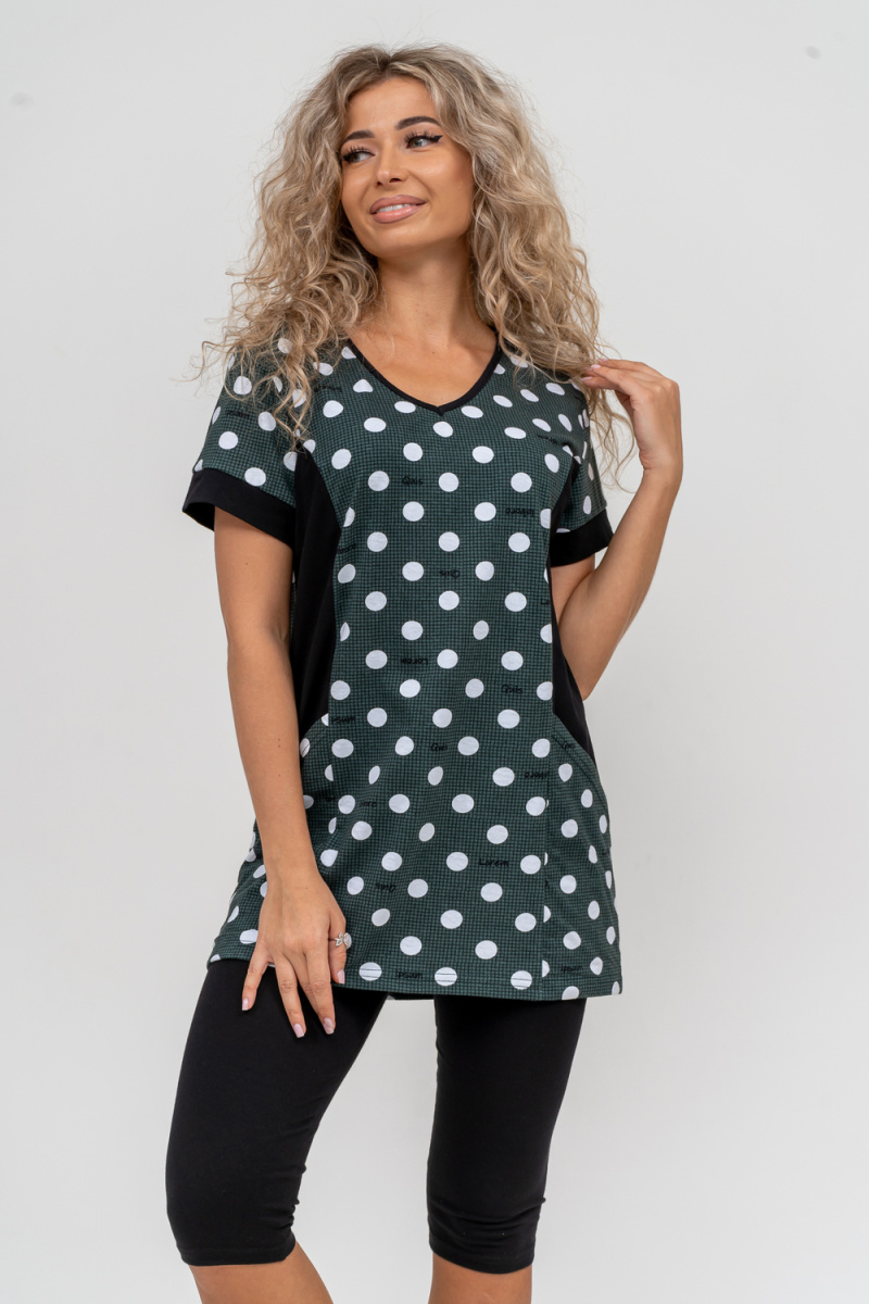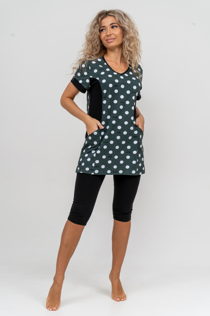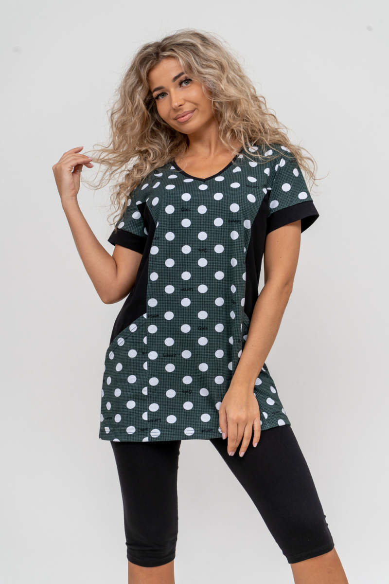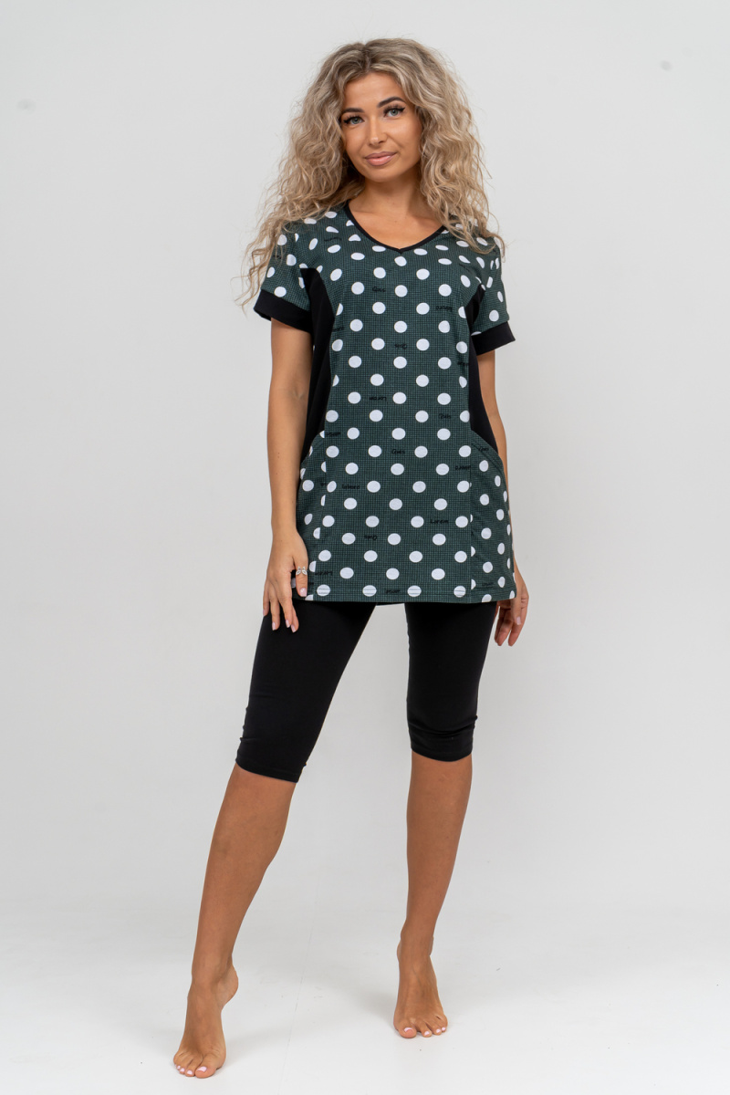 Женский костюм полуприлегающего силуэта состоит из туники и бриджей. 100% дышащий хлопок туники и эластичная вискоза бриджей несут в себе удобство при носке, гигроскопичность и износостойкость. V-образный вырез горловины придаёт изделию женственный вид. Для удобства туника имеет вместительные накладные карманы и втачные рукава с манжетами. Рельефы на полочке изделия создают идеальную посадку и безупречный внешний вид. Бриджи на резинке с высокой посадкой. В костюме такого плана Вы будете чувствовать себя комфортно как дома, так и на любимой даче. Эта двойка идеально подойдет для летнего отдыха на даче, на море или просто для девушек, которые хотят чувствовать себя уютно и комфортно дома. Летний женский костюм подходит для поездок и путешествий, загородного отдыха на природе, а также для получения лечения в больнице или санатории. Повседневное хлопковое изделие с бриджами - отличная идея для подарка любимой жене, маме, сестре или подруге на день рождения, 8 Марта или по любому другому приятному поводу. Рекомен