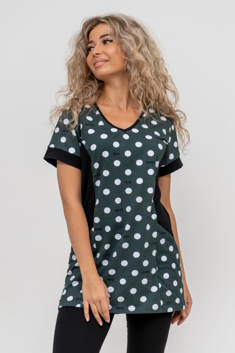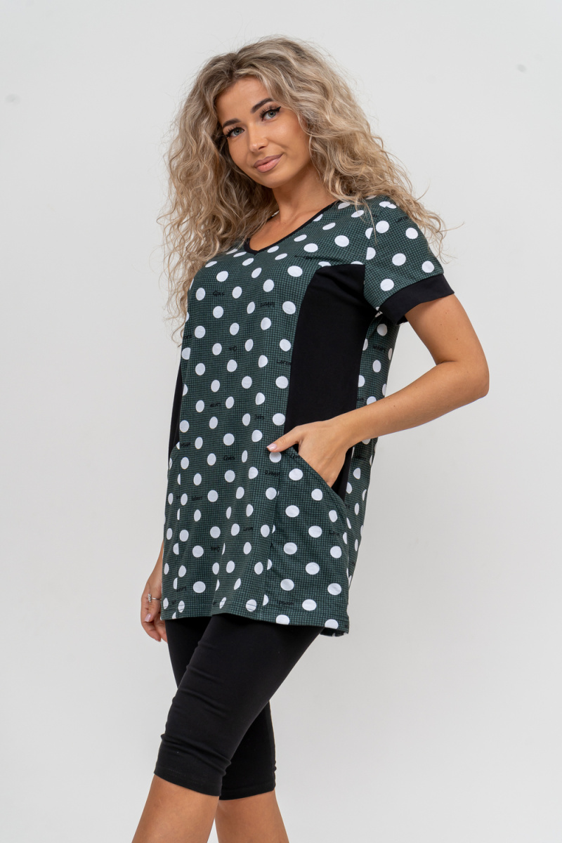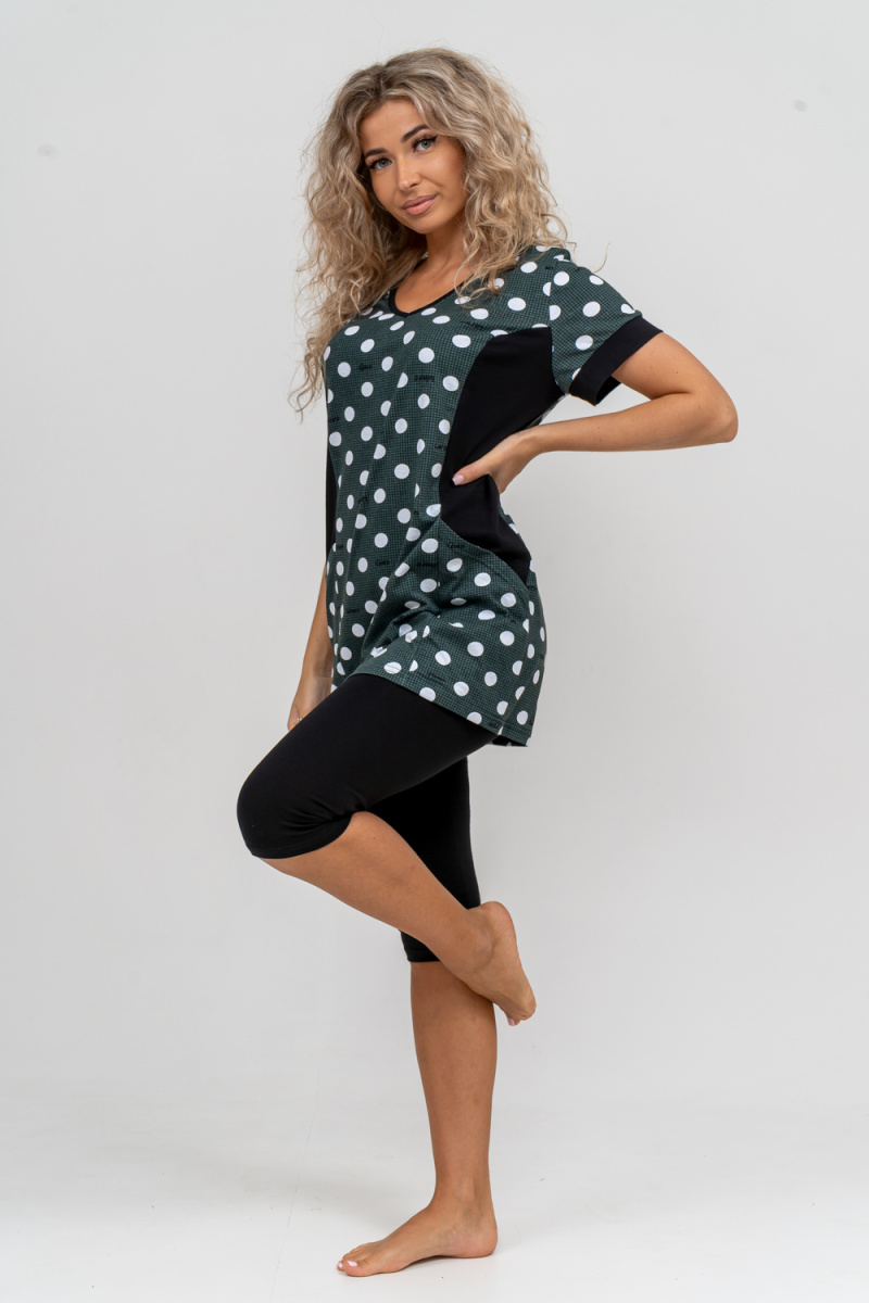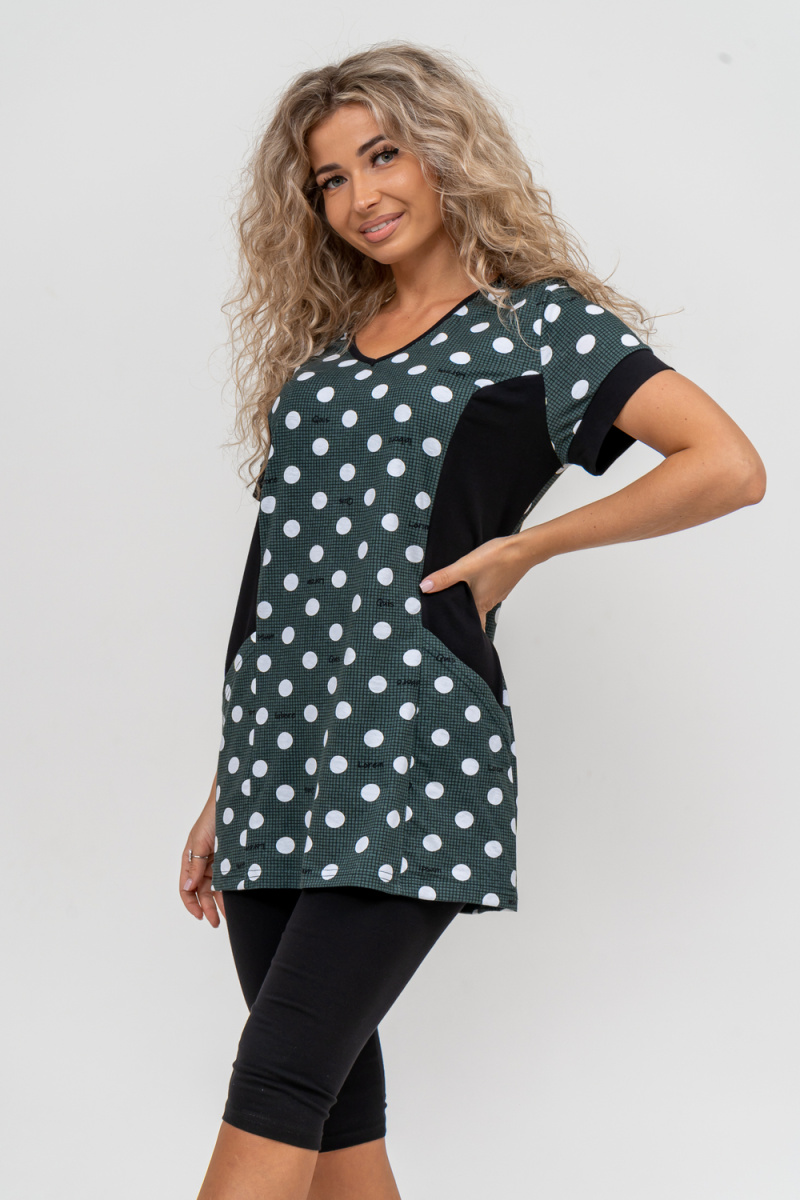 Женский костюм полуприлегающего силуэта состоит из туники и бриджей. 100% дышащий хлопок туники и эластичная вискоза бриджей несут в себе удобство при носке, гигроскопичность и износостойкость. V-образный вырез горловины придаёт изделию женственный вид. Для удобства туника имеет вместительные накладные карманы и втачные рукава с манжетами. Рельефы на полочке изделия создают идеальную посадку и безупречный внешний вид. Бриджи на резинке с высокой посадкой. В костюме такого плана Вы будете чувствовать себя комфортно как дома, так и на любимой даче. Эта двойка идеально подойдет для летнего отдыха на даче, на море или просто для девушек, которые хотят чувствовать себя уютно и комфортно дома. Летний женский костюм подходит для поездок и путешествий, загородного отдыха на природе, а также для получения лечения в больнице или санатории. Повседневное хлопковое изделие с бриджами - отличная идея для подарка любимой жене, маме, сестре или подруге на день рождения, 8 Марта или по любому другому приятному поводу. Рекомен