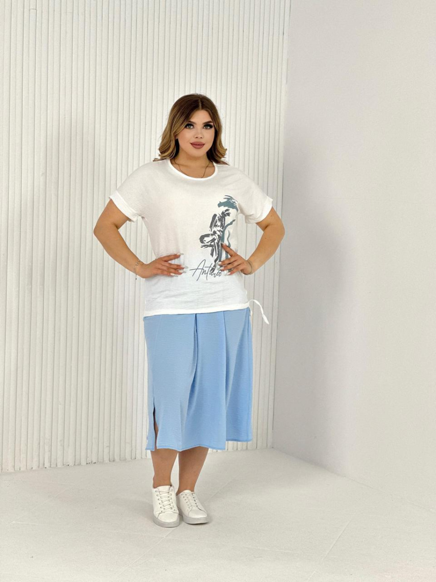 Женская двойка прямого силуэта. Верх комплекта в белом цвете с цветным принтом, короткий цельнокроеный рукав, низ футболки имеет свойство затягиваться, поэтому ее можно носить спущенную на юбку, а можно затянуть и оставить над ней, что подчеркнет вашу талию. Низ - свободная юбка двух цветов, с двумя разрезами снизу. Костюм повседневный и удобный, из легкой ткани сингапур, что хорошо для жаркого лета.