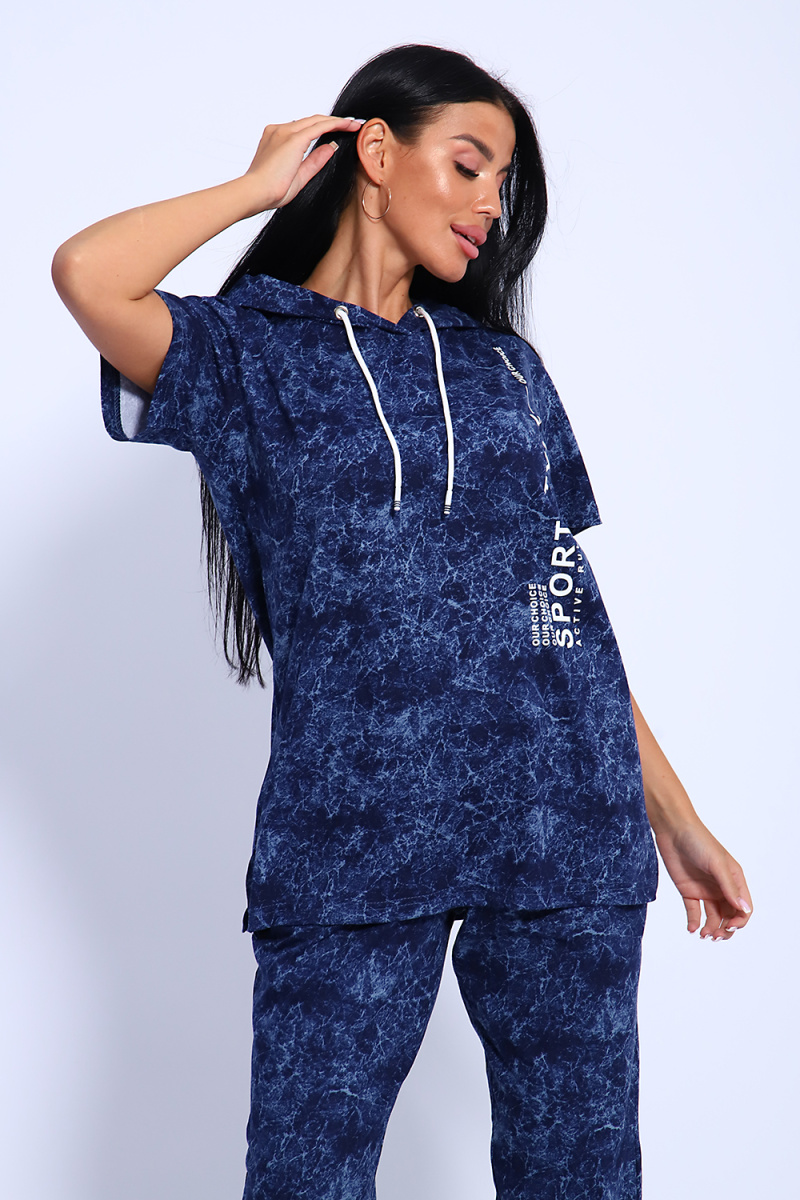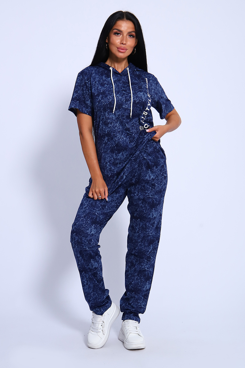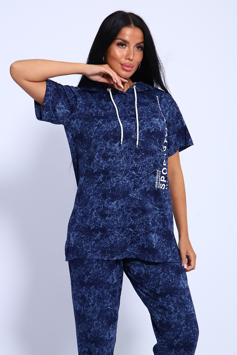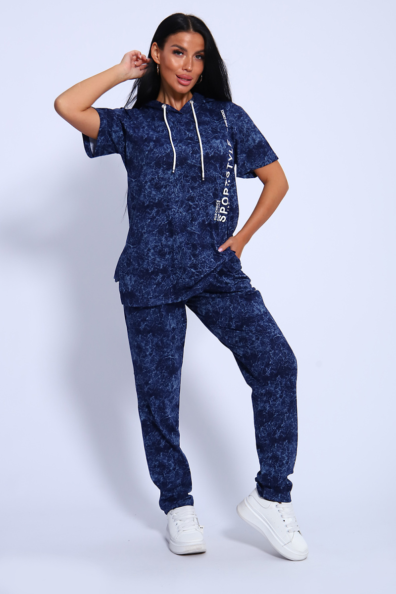 Яркий и стильный женский костюм из легкого дышащего трикотажного полотна высокого качества. Изюминкой костюма является рисунок ткани, имитирующий "вареную" джинсовку. для удобства модниц изделие представлено в 4-х ярких расцветках. На кофте имеется капюшон, объем которого регулируется тонкой лентой. Этот универсальный и практичный повседневный костюм в спортивном стиле будет удобным и комфортным во многих ситуациях. Комплект отлично подойдет для спорта, бега или танцев. Брюки свободные, с двумя боковыми карманами, на широком поясе с резинкой. Каждую вещь вполне можно использовать по отдельности. Комплект отлично подойдет для женщин любого возраста и поможет хозяйке выглядеть стильно, при этом даря чувство комфорта!