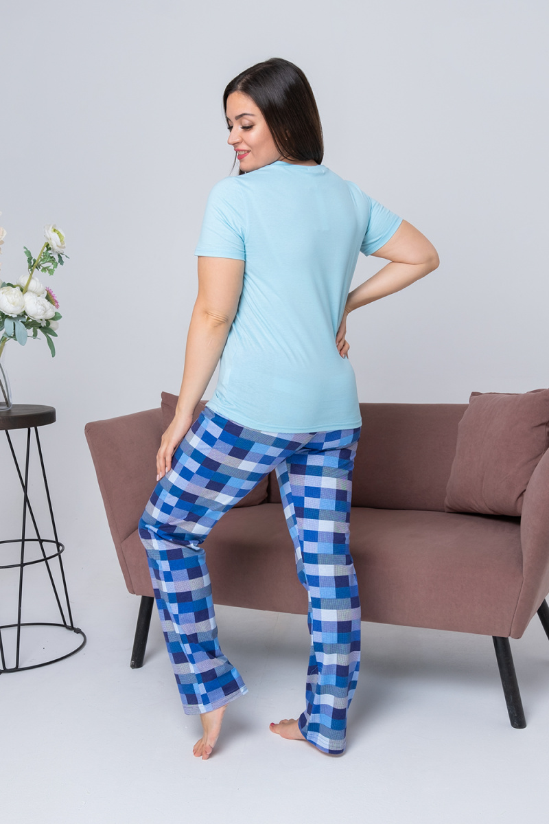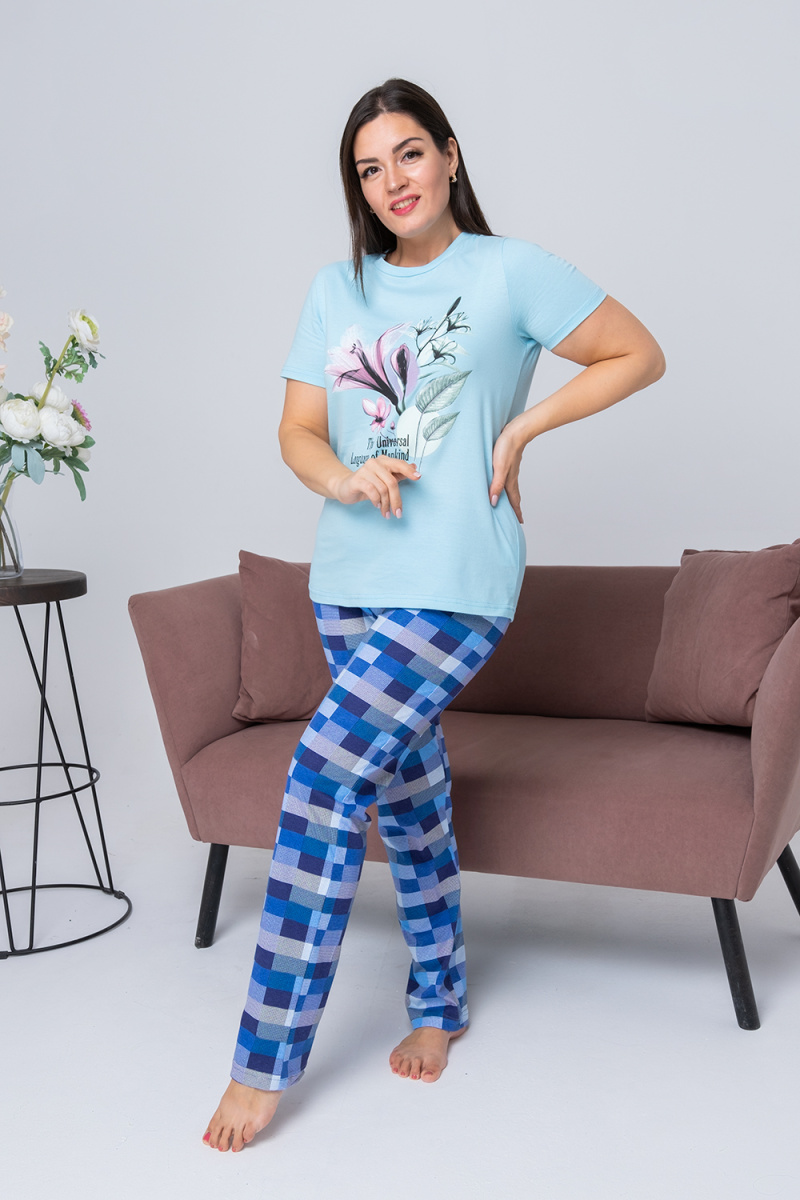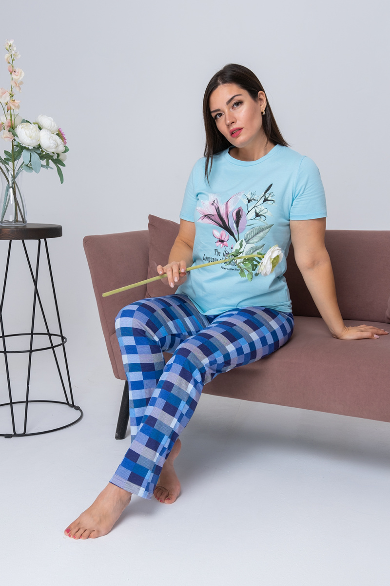 Костюм женский состоит из футболки с коротким рукавом из ткани кулирка гладь, на полочке красивый принт, и брюк из ткани кулирка, принт - клетка. Костюм для дома, отдыха, комфортный, удобный, не меняет цвет после стирки.
