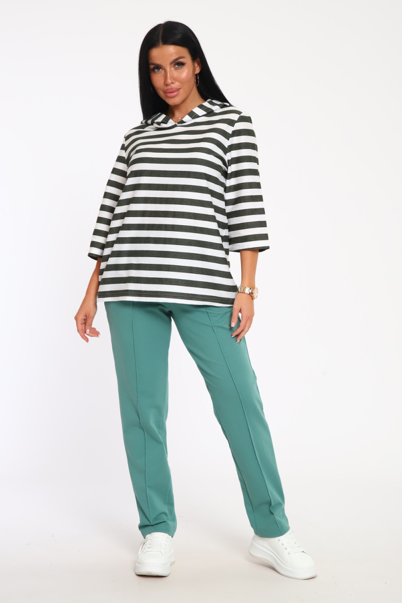 Представляем Вашему вниманию современный костюм, состоящий из брюк и футболки с капюшоном. Футболка в полоску –это модный тренд уже несколько сезонов подряд Футболки с капюшоном-универсальная вещь, которая обязательно должна присутствовать в гардеробе любой девушки и женщины. В сочетании с такой футболкой можно наработать огромное количество образов, как на каждый день ,так и для различных мероприятий. Обожающие эксперименты девушки и женщины могут сочетать футболку с классическими брюками, чтобы соответствовать экстравагантному стилю спортшик. Наша модель брюк с отстроченной стрелкой спереди, двумя боковыми карманами, поясом на резинке отлично подходит для этого. Добавить к стильному луку можно туфли на высоком каблуке или стильные ботинки на толстой подошве .Женщина будет выглядеть независимо и очень модно. Наряд можно дополнить яркими аксессуарами и образ уже подойдет для выхода в люди. Футболка выполнена из 100%хлопка.В ней будет комфортно в любую погоду .Брюки выполнены из трикотажного полотна .которое