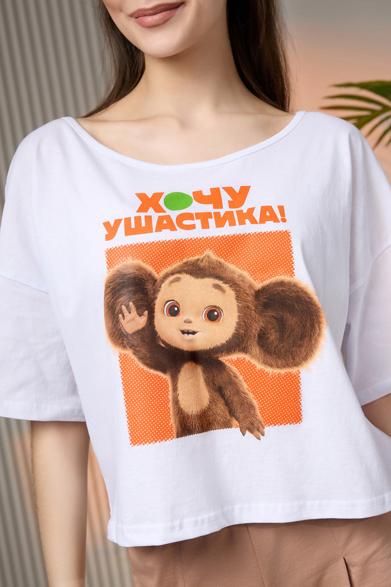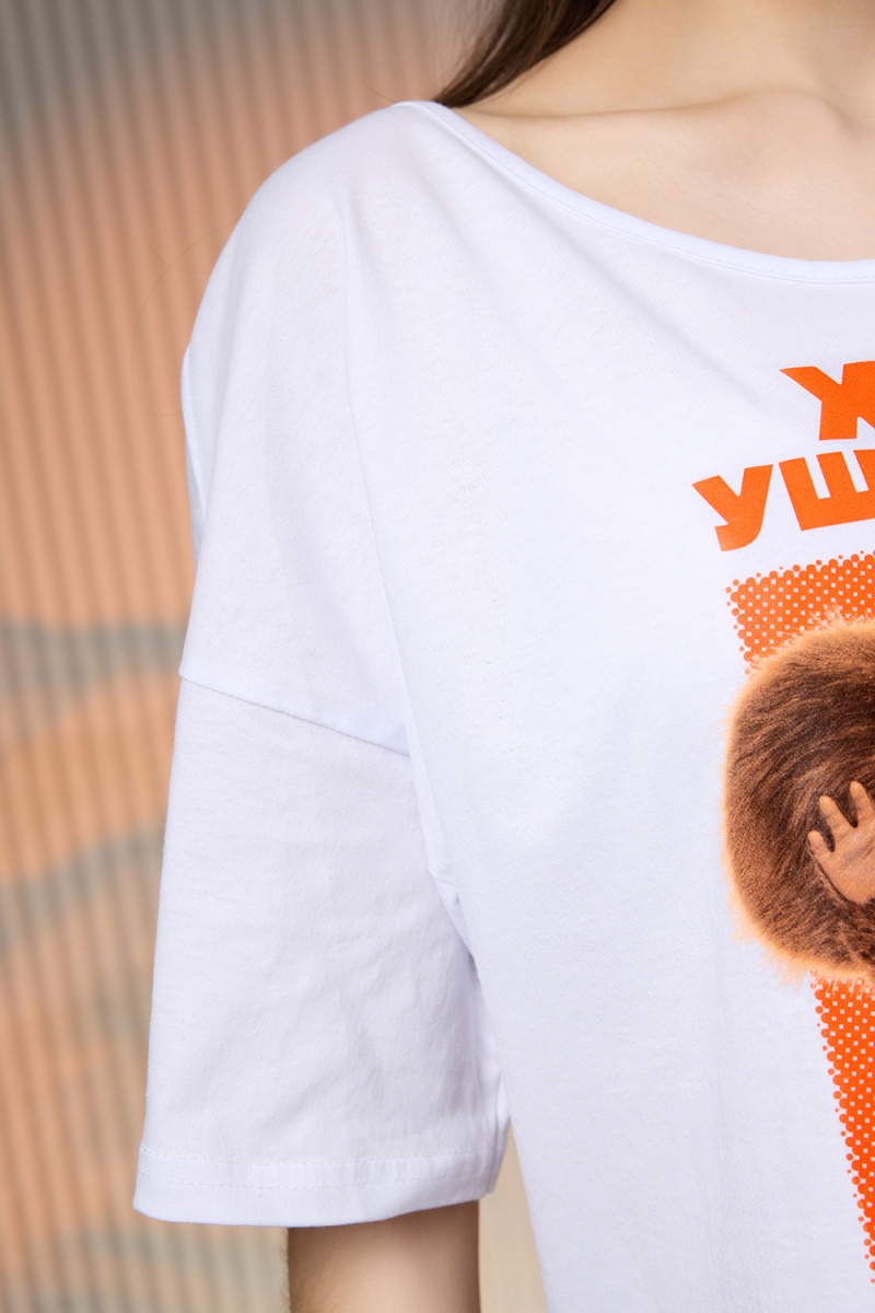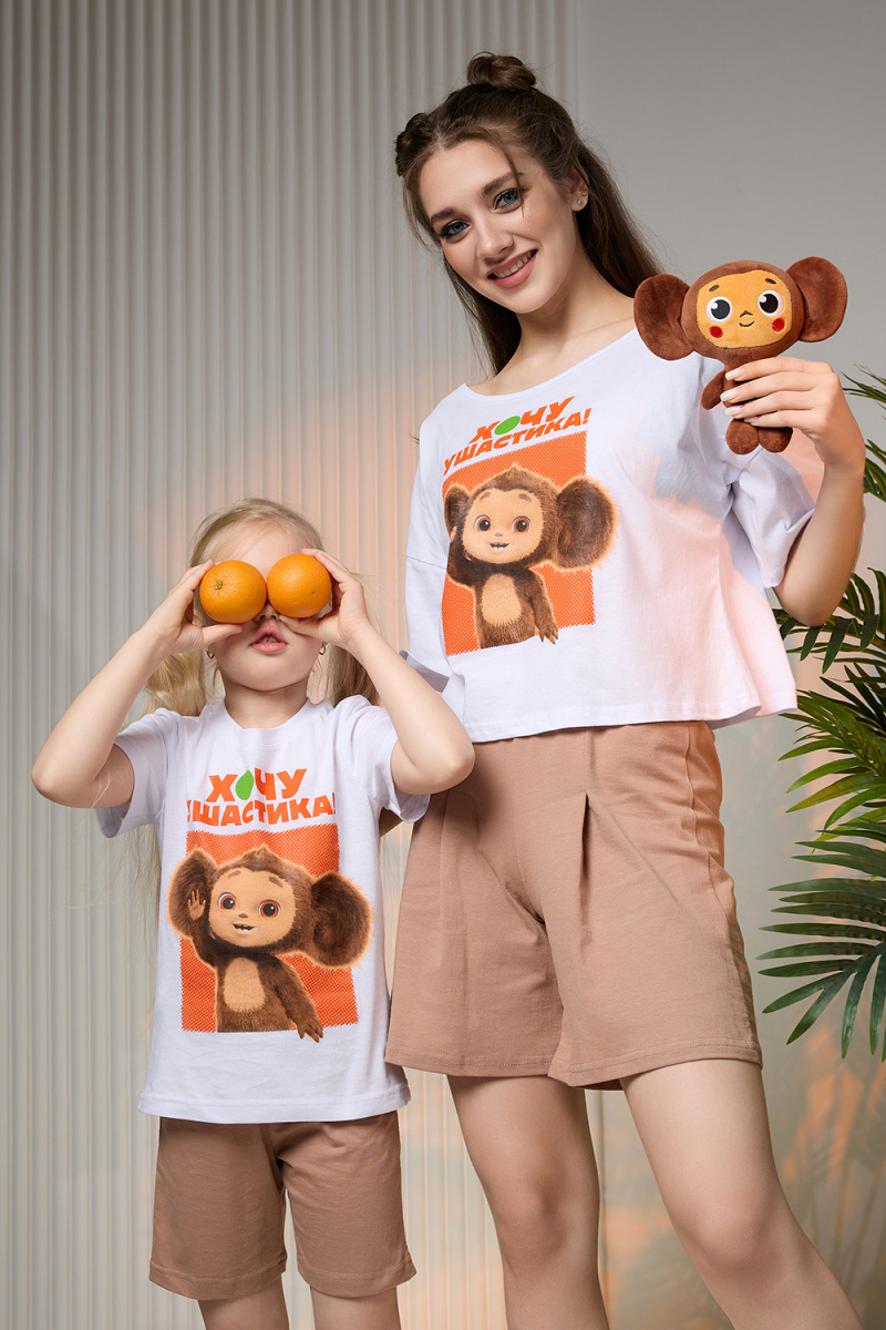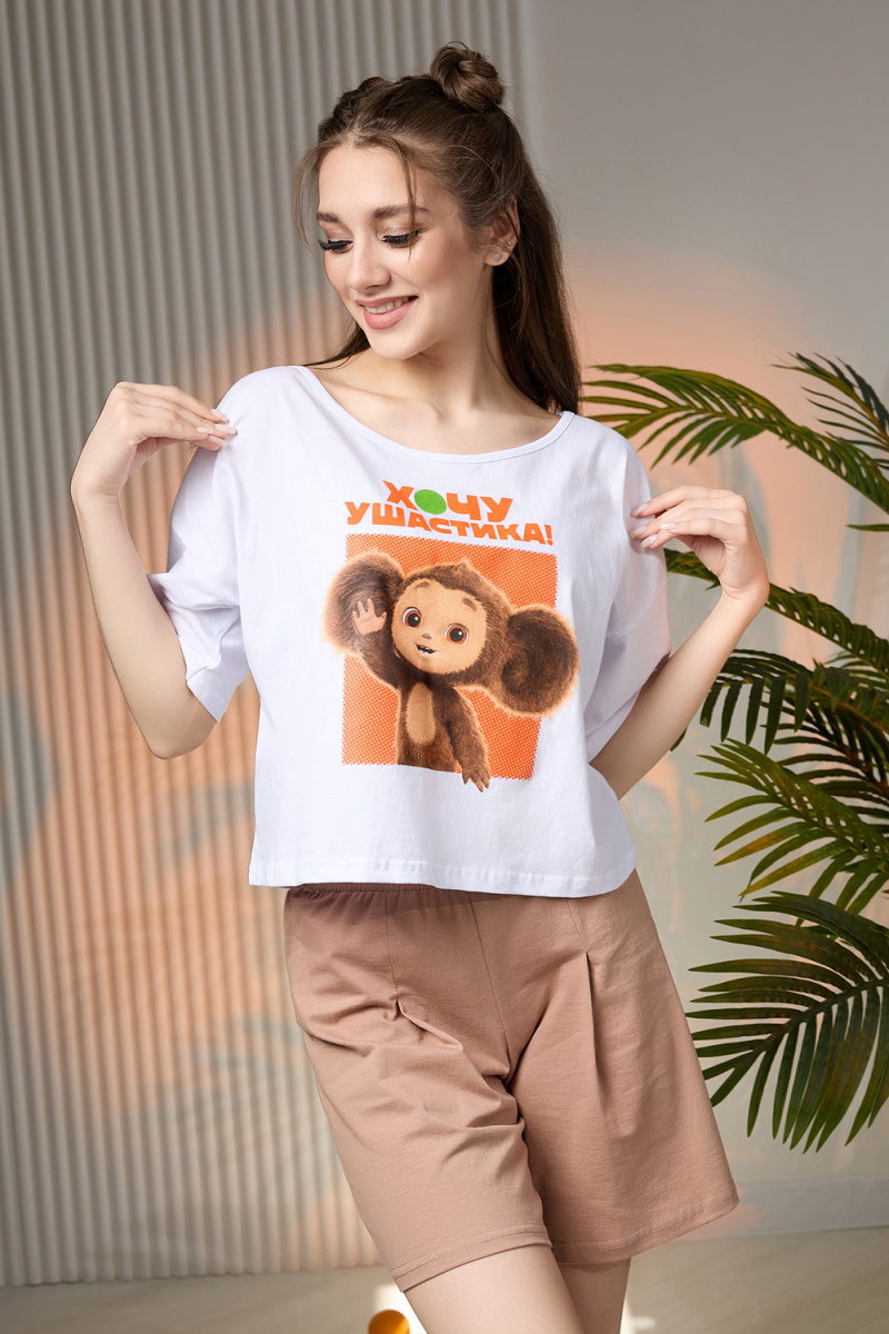 Костюм состоит из укороченной футболки "оверсайз" и шорт. Футболка с округлой горловиной. Рукав короткий. Горловина обработана бейкой из основного полотна. Шорты на резинке, со складками в верхней части передних половинок.