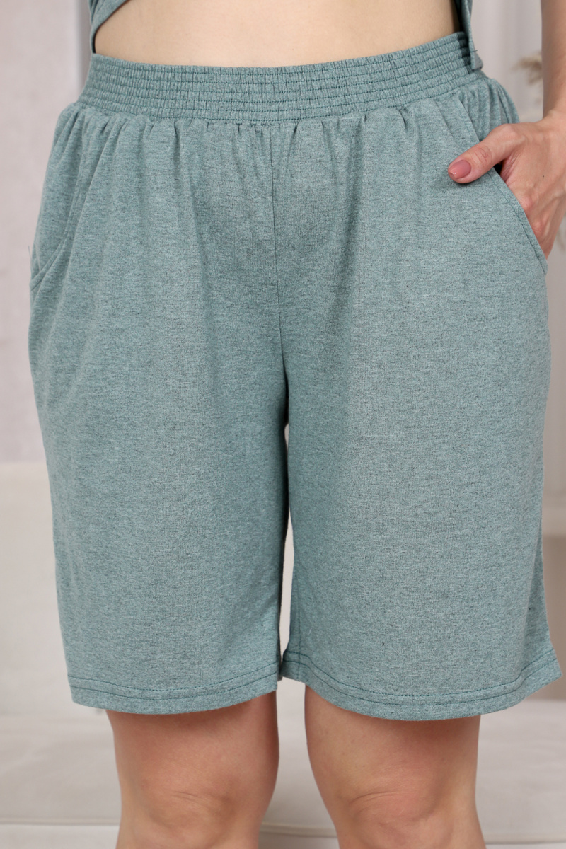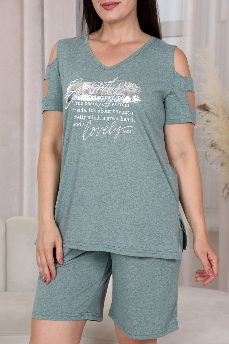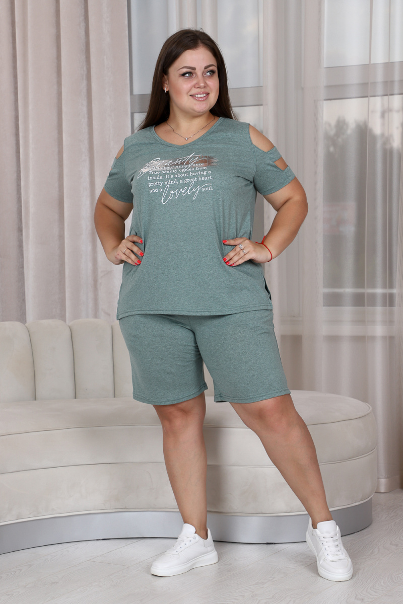 Костюм женский: туника и шорты. Туника прямого силуэта, вырез Y-образный. В боковых швах разрезы. На полочке принт. Рукав не цельный, два хлястика, расположенные через расстояние друг от друга, втачаны в боковые части рукава. Шорты свободные до колена, на передней части внутренние карманы, пояс выполнен на многоигольной машине.